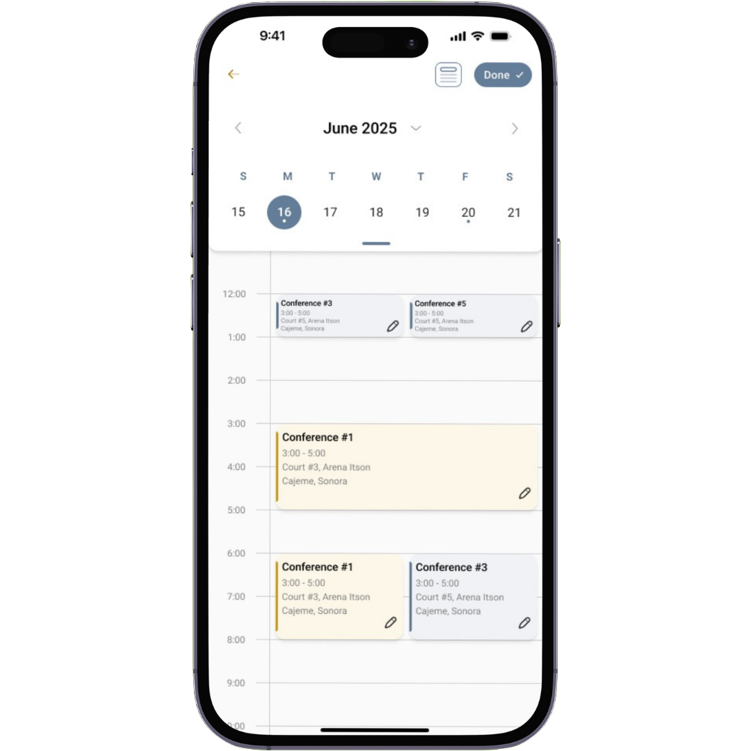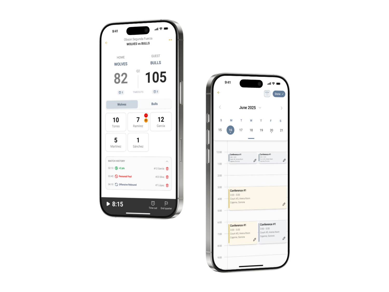 Live scoring had to work under pressure: loud environments, officials focused on the game, no time for mistakes. The design prioritizes speed — large tap targets, always-visible score, immediate visual feedback, and undo support. Stats update in real time so coaches and spectators see performance as it happens.