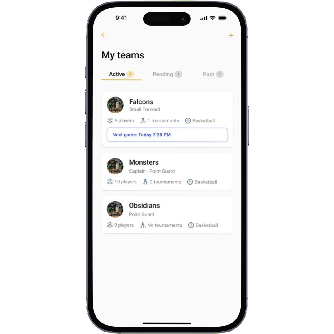 Active, Pending, and Past tabs filter teams by engagement status. Each card surfaces key info at a glance: role within the team, roster size, tournament count, and upcoming match details when relevant, reducing the need to drill into each team to understand current priorities.